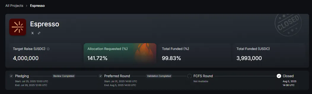 Espresso의 투자 라운드 중 흥미로운 것은 Kaito 런치패드에서의 토큰 세일이다. Espresso는 Kaito의 첫 런치패드 프로젝트로서 상당히 큰 관심을 받았으며, 최종적으로 141.72%의 초과 구독이 이루어지며 성공적으로 세일을 마감했다.