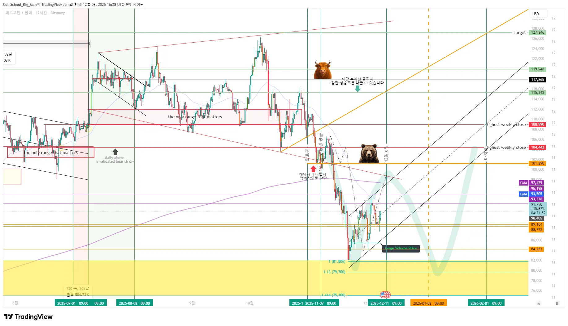 이제는 Bear Flag 즉 하락 추세중 기술적 반등구간을 말하는데 이 시나리오가 무효화가 되는자리는 95.8K 부근이다