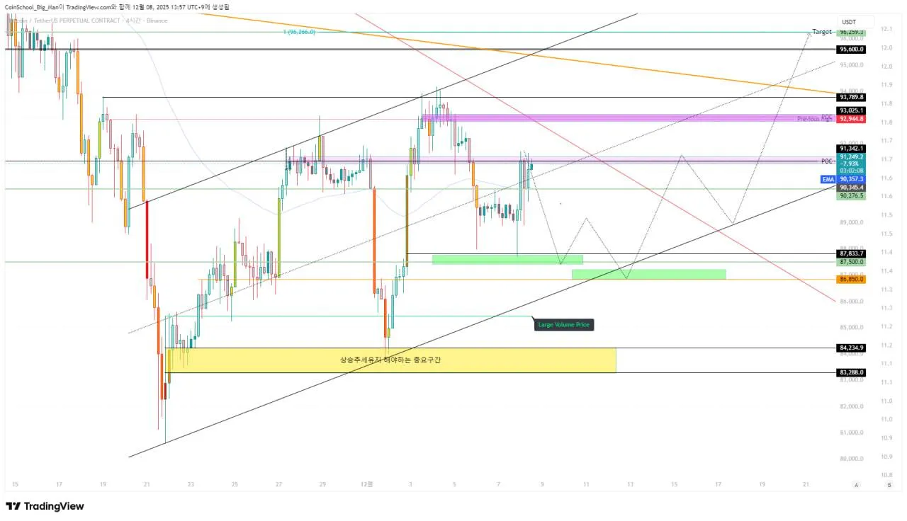단 상승채널속에서 하락이 우선순위가 되는건 86.8K 이탈시 78.3K 까지 열려있으니 리스크 관리는 철저하게 해두시길 바라겠습니다.