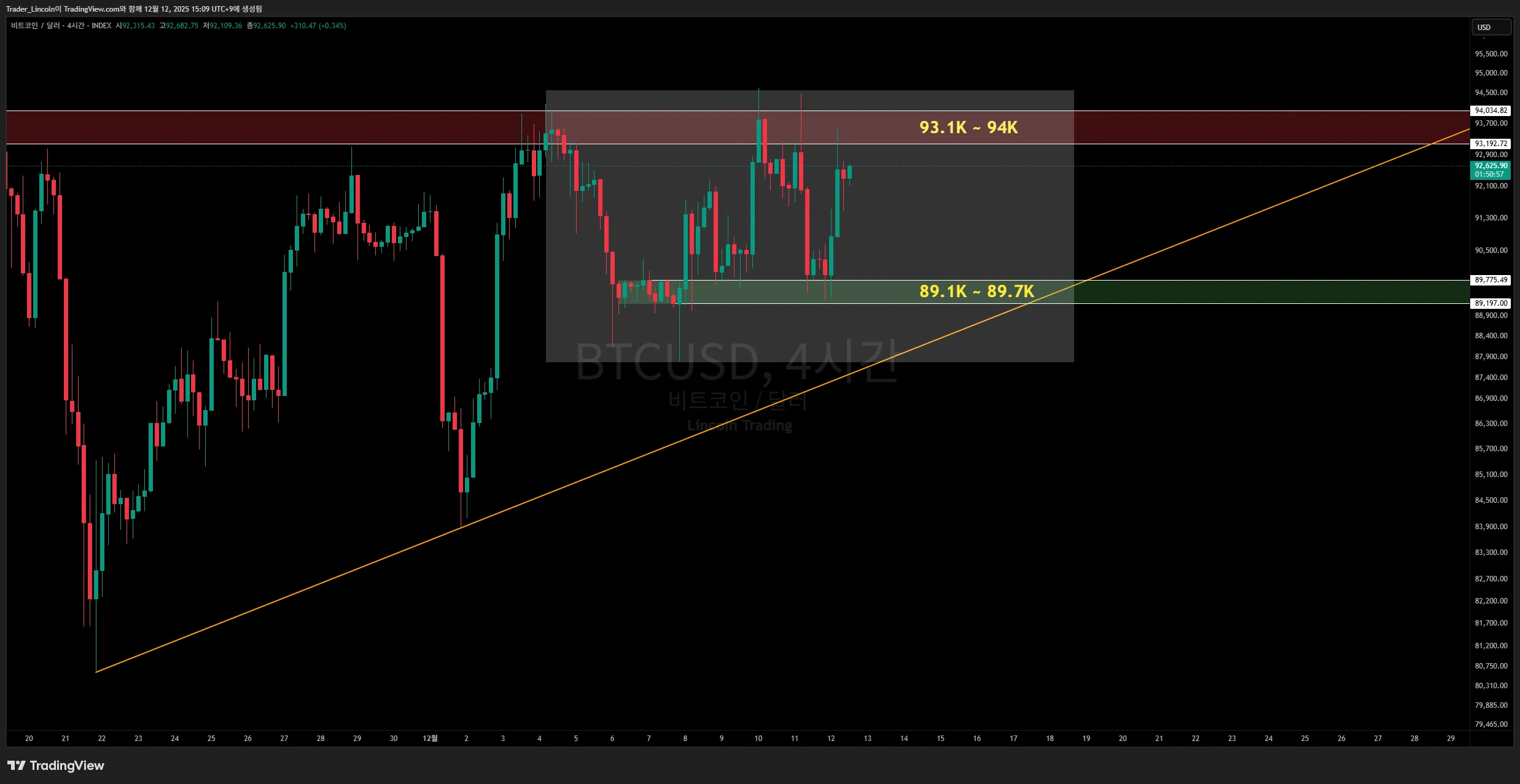 더불어 어센딩 트라이앵글 구조 상단부에서 종가 기준 '89.1K ~ 94K' 레인지 횡보가 진행 중입니다.