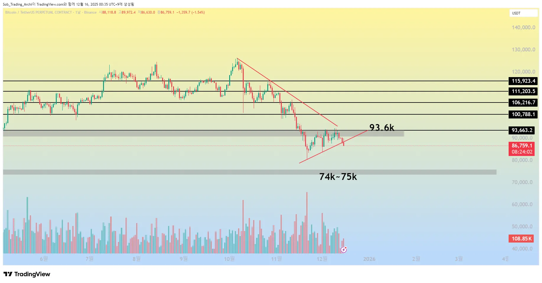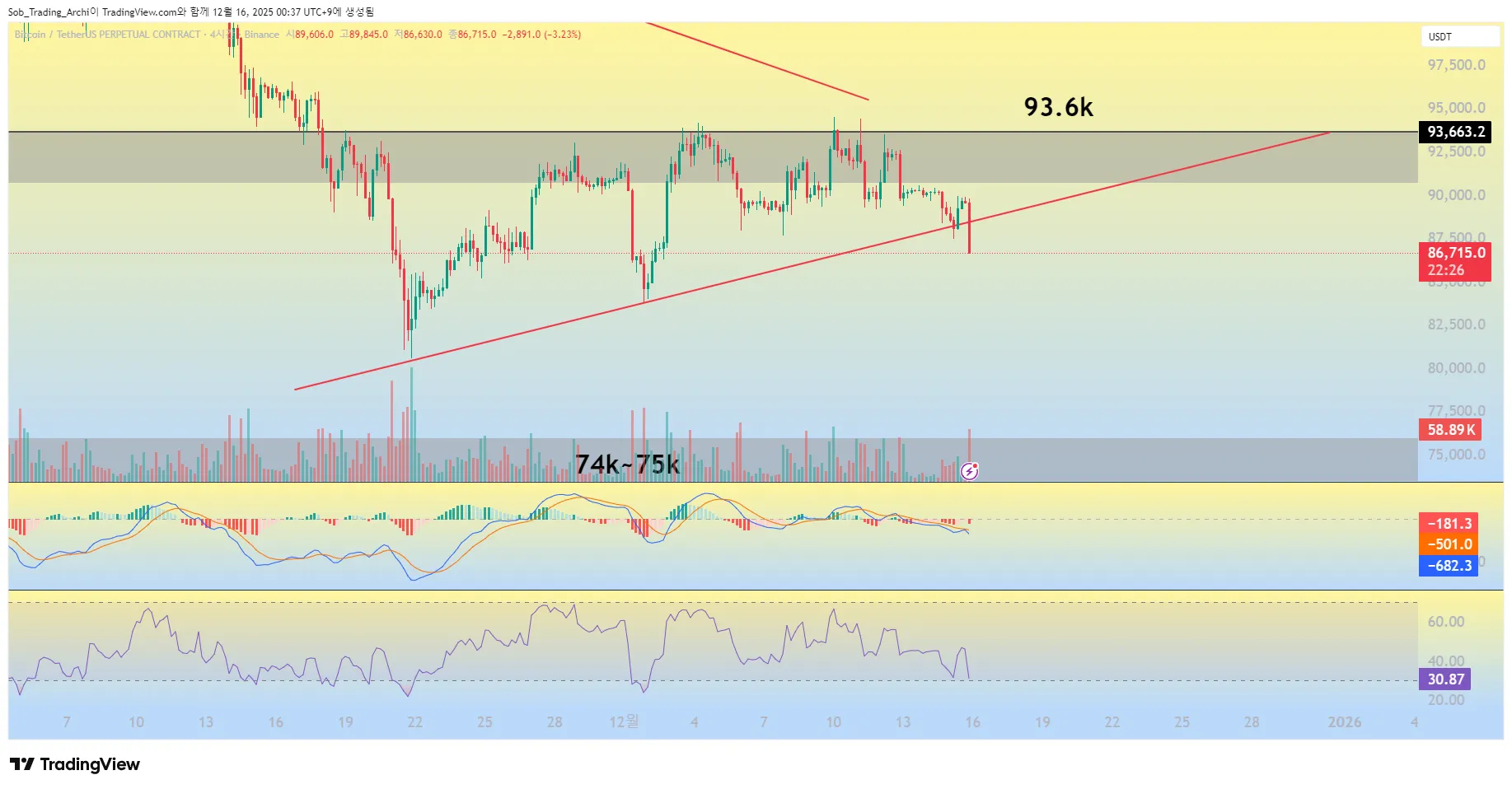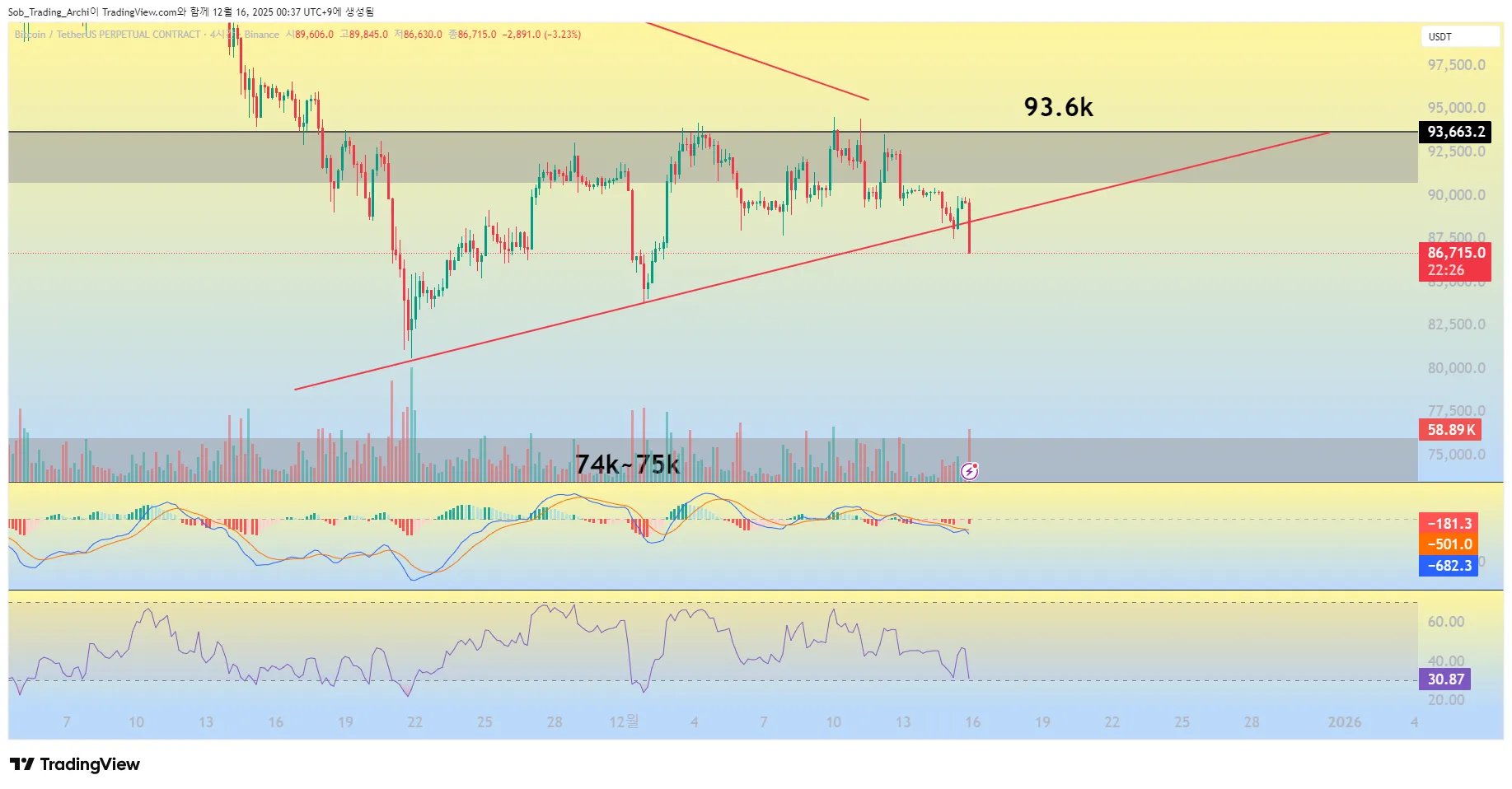 강한 지지라인인 74~75k까지 갈 확률이 매우 높으며,