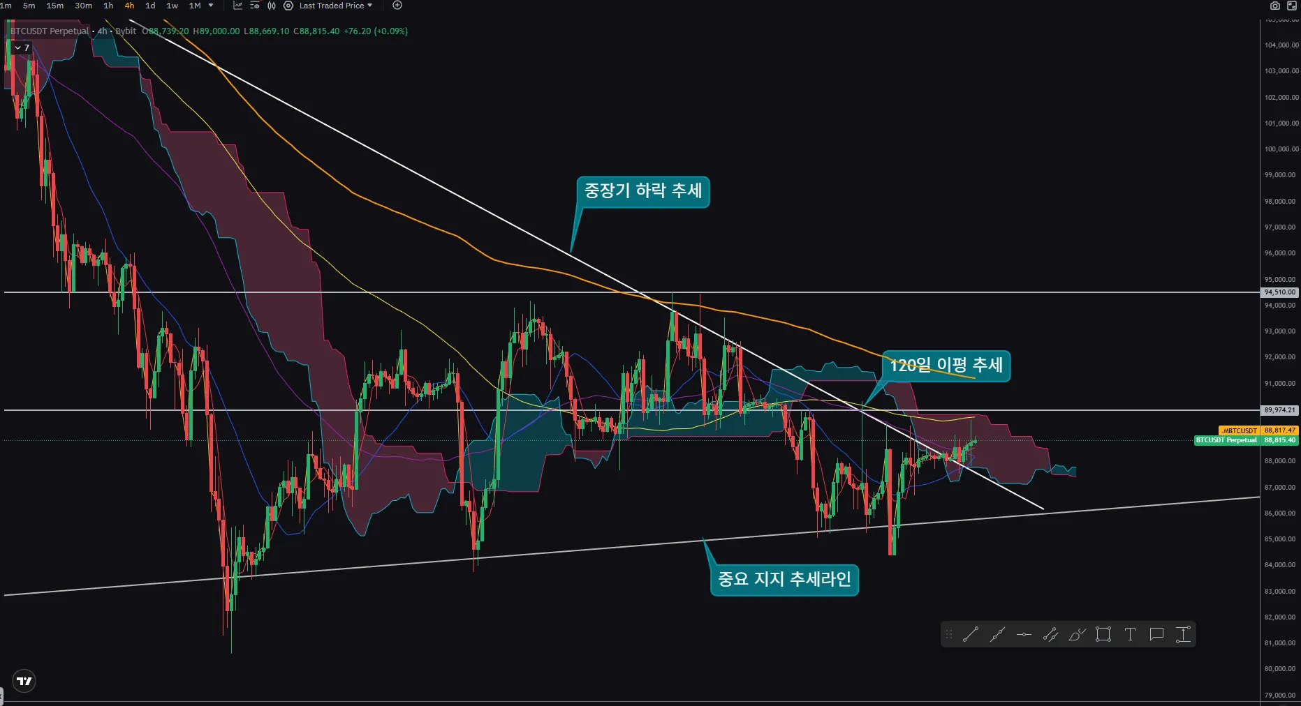 - 핵심 지지: 85~86K (중요 지지 추세라인)