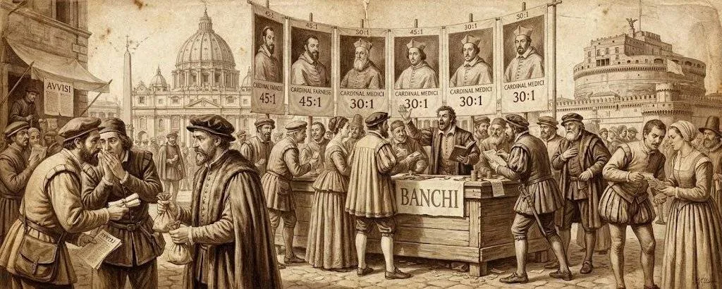 로마의 금융 지구인 '반키(Banchi)'의 은행들은 추기경들의 당선 확률을 0에서 100까지의 가격으로 환산하여 거래했다. 이는 오늘날 예측 시장의 이진 옵션(Binary Option) 구조와 수학적으로 동일하다. '센살리(Sensali)'라 불리는 중개인들이 광장을 뛰어다니며 주문을 체결했고, 배당률은 실시간으로 변동했다.