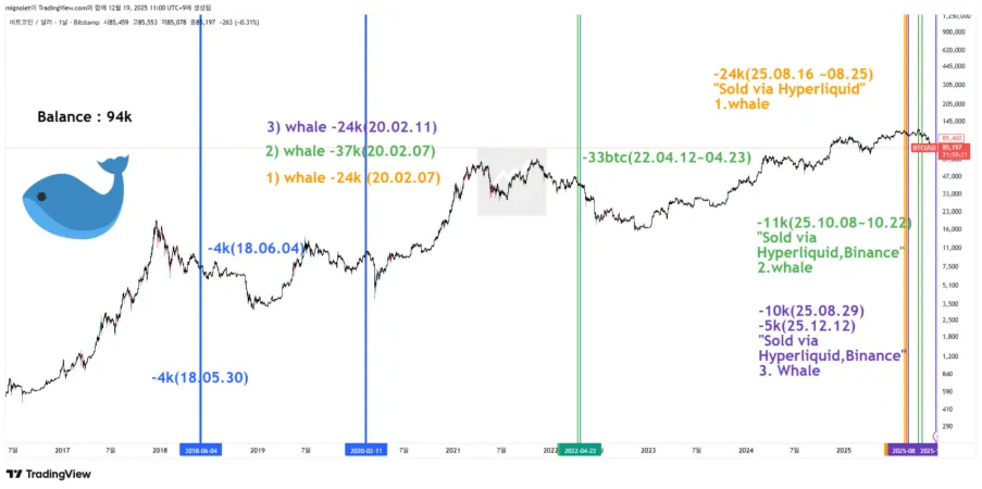 해당 고래는 최초에 약 9만 4000 BTC를 보유하고 있었습니다.