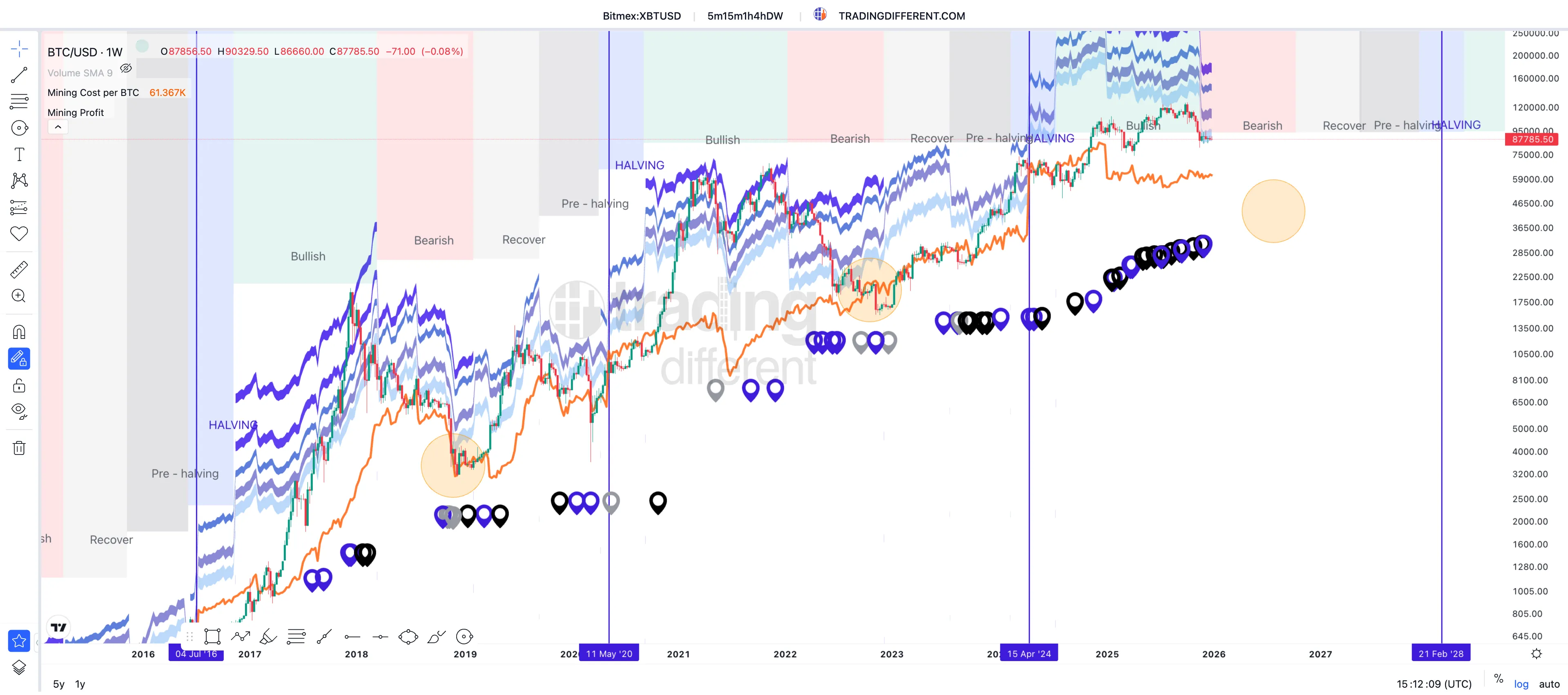 그리고 주황색 동그라미 부분이 바로 $BTC 하락 구간의 끝, 사이클의 최저점에서 $BTC 채굴원가를 하회하는 모습을 보여주는 지점들입니다.