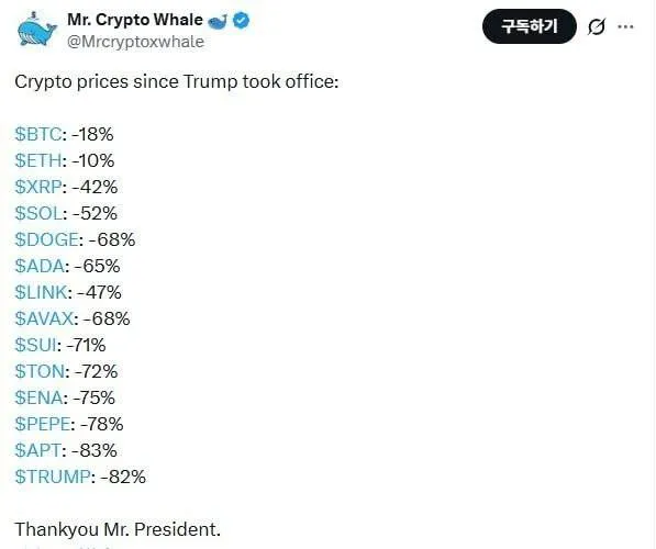 리플 -42%, 솔라나 -52% 도지코인 -68% 에이다 -65%, 맨 밑에 트럼프 코인은 -82%가 하락했습니다.