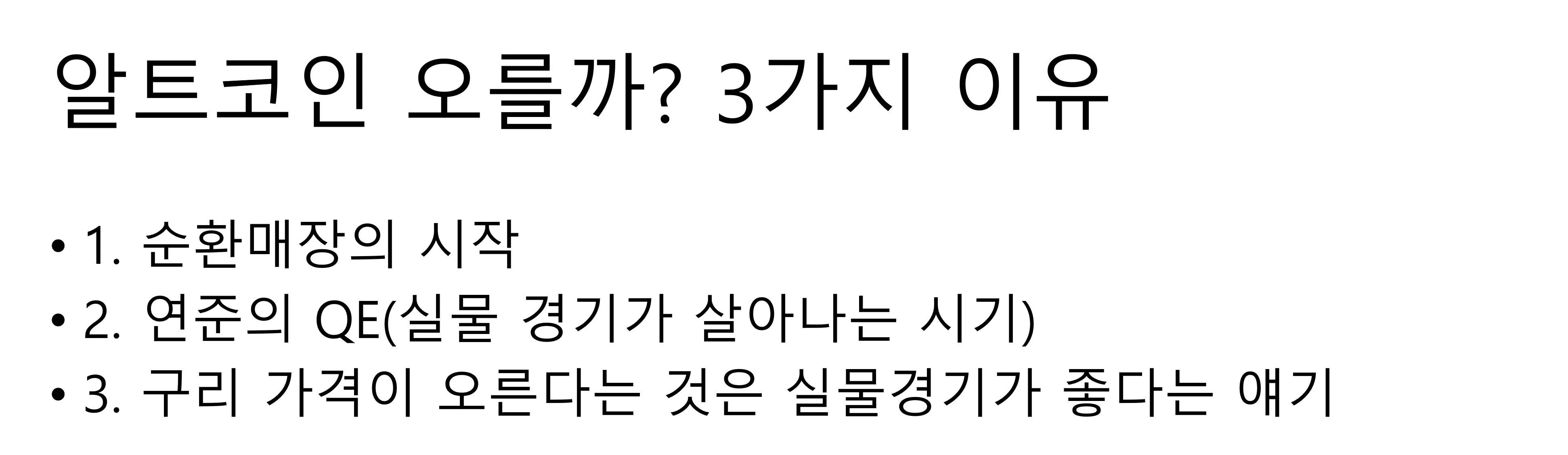 저는 미과장님의 말씀처럼, 내년에 실물경기가 살아나면서, 구리의 가격이 폭등하게 되면 그에 따라서 알트코인도 큰 상승을 하리라 보고 있습니다.