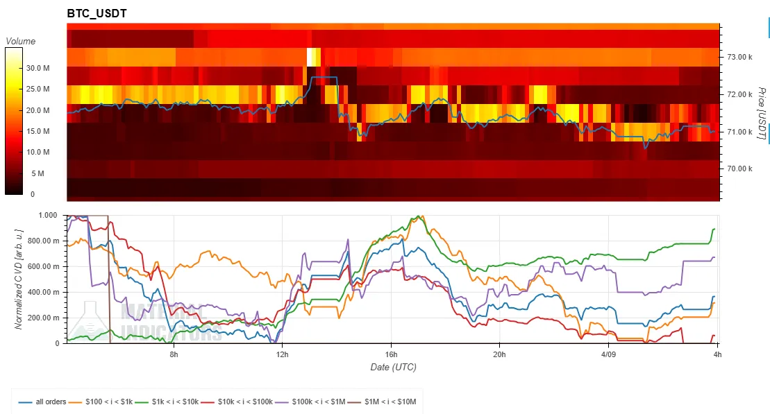- The bottom CVD indicator represents buy and sell orders categorized by trade size. As buy orders increase, the corresponding colored line rises. The yellow line indicates orders between $100 and $1,000, while the brown line represents large orders between $1 million and $10 million.