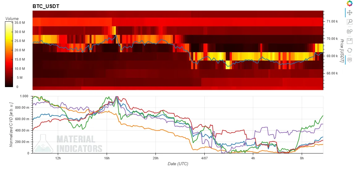 - The bottom CVD indicator represents buy and sell orders categorized by the size of the funds involved. As buy orders increase, the corresponding colored line rises. The yellow line indicates orders between $100 and $1,000, and the brown line represents large orders between $1 million and $10 million.