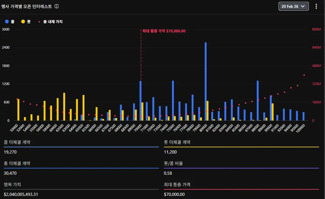 According to crypto options exchange Deribit, Bitcoin options worth $2 billion are set to expire at 8:00 a.m. UTC on Feb. 20. The put/call ratio is 0.58, and the max pain price—the point at which the most option buyers would lose their premiums—is $70,000. Additionally, Ethereum options valued at $410 million will expire at the same time. For ETH, the put/call ratio is 0.73, with a max pain price of $2,025.