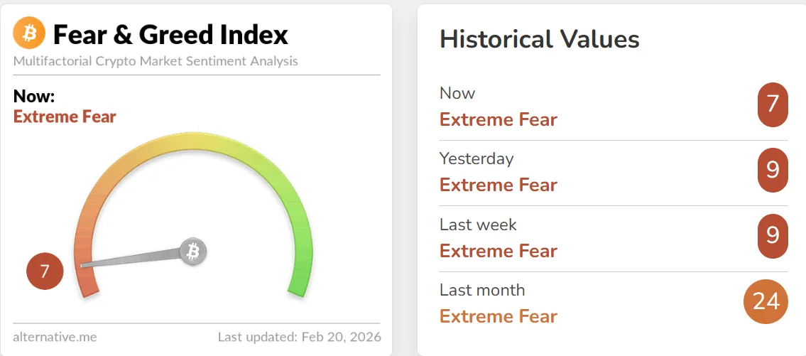 The Crypto Fear & Greed Index from data provider Alternative has dropped two points from yesterday to 7, signaling a continued state of extreme fear. The index measures market sentiment on a scale of 0, representing extreme fear, to 100, indicating extreme optimism. It is calculated based on volatility (25%), trading volume (25%), social media mentions (15%), surveys (15%), Bitcoin's market cap dominance (10%), and Google search volume (10%).