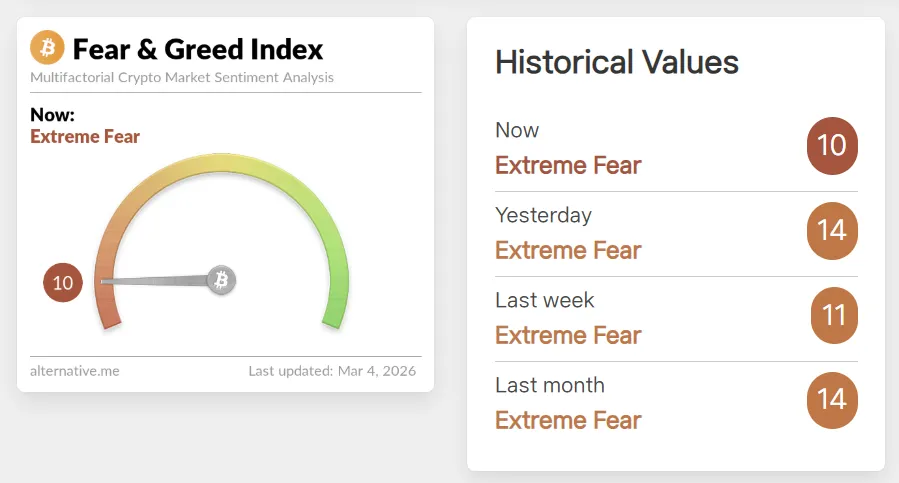 The Crypto Fear & Greed Index has fallen four points to 10, remaining in the "Extreme Fear" range, according to data from Alternative. The index, which shifted from "Fear" to "Extreme Fear" on Jan. 30, has stayed at the latter level since. The metric measures market sentiment on a scale from zero (extreme fear) to 100 (extreme optimism). It is calculated based on volatility (25%), trading volume (25%), social media mentions (15%), surveys (15%), Bitcoin's dominance (10%), and Google search volume (10%).