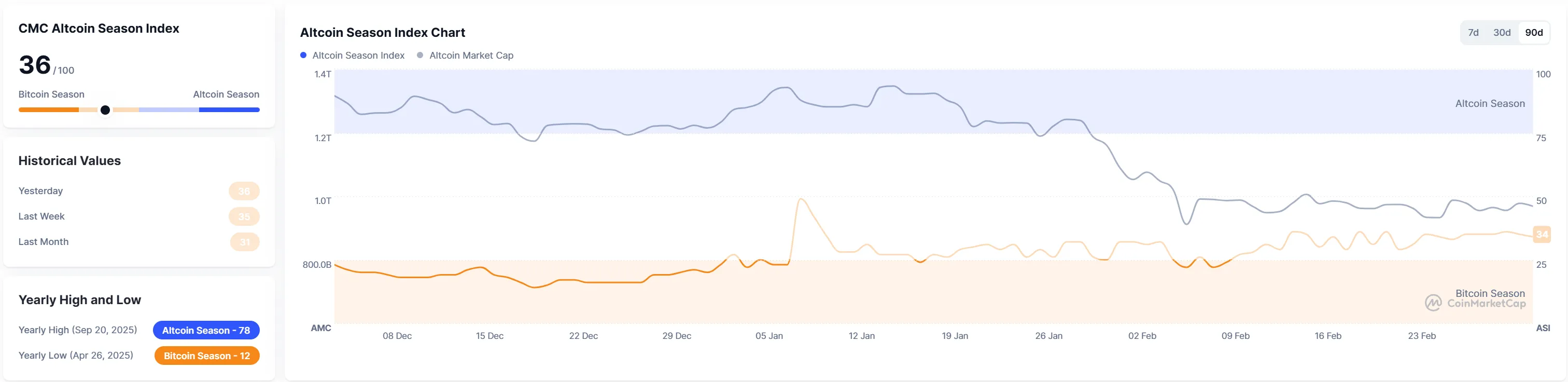 The Altcoin Season Index from crypto data aggregator CoinMarketCap stands at 36, unchanged from yesterday. The index is calculated by comparing the price performance of the top 100 cryptocurrencies, excluding stablecoins and wrapped coins, against that of Bitcoin. An "altcoin season" is declared when 75% of these top 100 coins outperform Bitcoin over the preceding 90 days. The opposite scenario is considered a "Bitcoin season." A score closer to 100 indicates a stronger altcoin season.