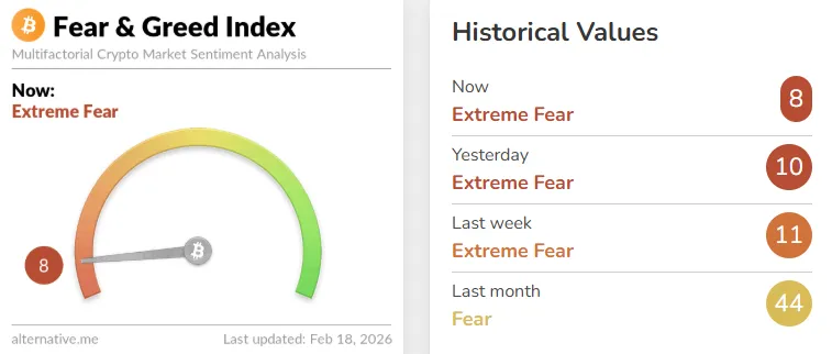 The Crypto Fear & Greed Index from data provider Alternative has dropped two points from yesterday to 8, keeping the market in a state of extreme fear. The index measures sentiment on a scale of 0 to 100, where 0 indicates extreme fear and 100 represents extreme optimism. The score is calculated based on volatility (25%), trading volume (25%), social media mentions (15%), surveys (15%), Bitcoin's market cap dominance (10%), and Google search volume (10%).