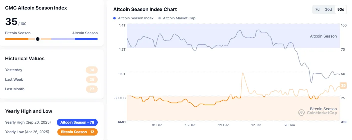 CoinMarketCap's Altcoin Season Index has reached 35, an increase of six points from yesterday. The index is calculated by comparing the price performance of the top 100 coins by market capitalization, excluding stablecoins and wrapped coins, against that of Bitcoin over the past 90 days. An altcoin season is declared when 75% of these top coins outperform Bitcoin during this period. A score closer to 100 indicates an altcoin season, while the opposite is considered a Bitcoin season.