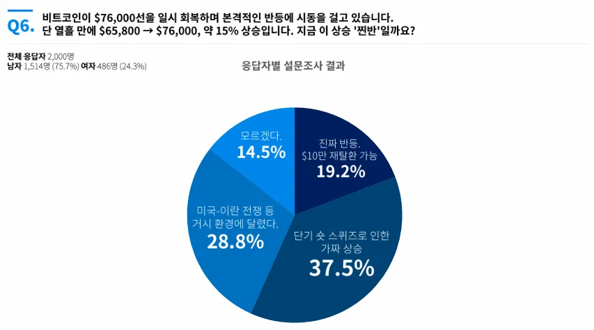 According to a weekly survey of South Korean investors conducted by CoinNess and Cratos, bearish sentiment has regained dominance. The poll found that 41.3% of respondents expect Bitcoin to fall or drop sharply next week, up from 30.5% the previous week. Conversely, 35.6% anticipate a rise or surge (up from 27.3%), while 23.1% predict sideways movement (down from 32.2%). Reflecting this caution, 43.2% of participants described the current market sentiment as one of fear or extreme fear. Neutral sentiment was expressed by 29.5%, and optimism by 27.3%. When asked about Bitcoin's temporary recovery to the $76,000 level earlier this week, the largest group of respondents (37.5%) dismissed it as a "fake rally" caused by a short squeeze. Another 28.8% believe BTC's direction will ultimately be determined by macroeconomic factors such as the U.S.-Iran war, while 19.2% view it as a genuine rebound with the potential to reclaim $100,000. The remaining 14.5% were unsure.