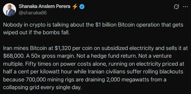 A potential military conflict between the U.S. and Iran could send a shockwave through the entire Bitcoin network, as Iran's Islamic Revolutionary Guard Corps (IRGC) is using BTC mining as a key tool to evade sanctions. This is according to financial analyst and geopolitical writer Shanaka Anslem Perera in a post on X.