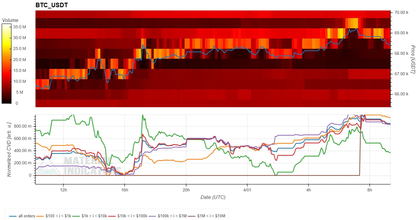 - The Cumulative Volume Delta (CVD) indicator (bottom) shows buy and sell orders categorized by trade size. A rising line indicates an increase in buy orders for that category. For example, the yellow line represents orders between $100 and $1,000, while the brown line tracks large orders between $1 million and $10 million.