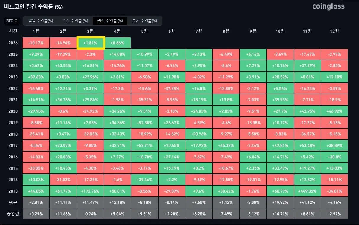 Bitcoin and Ethereum both closed March with gains, ending their respective streaks of monthly losses. According to Coinglass data, Bitcoin had recorded five consecutive months of losses from October through February, its second-longest stretch of declines on record. Its longest-ever losing streak was six straight months from August 2018 to January 2019. Ethereum had posted six consecutive months of losses from September through February, also its second-longest downtrend. The asset's longest decline was a seven-month period from May to November 2018. Market participants are now watching to see if this positive close signals a broader trend reversal.