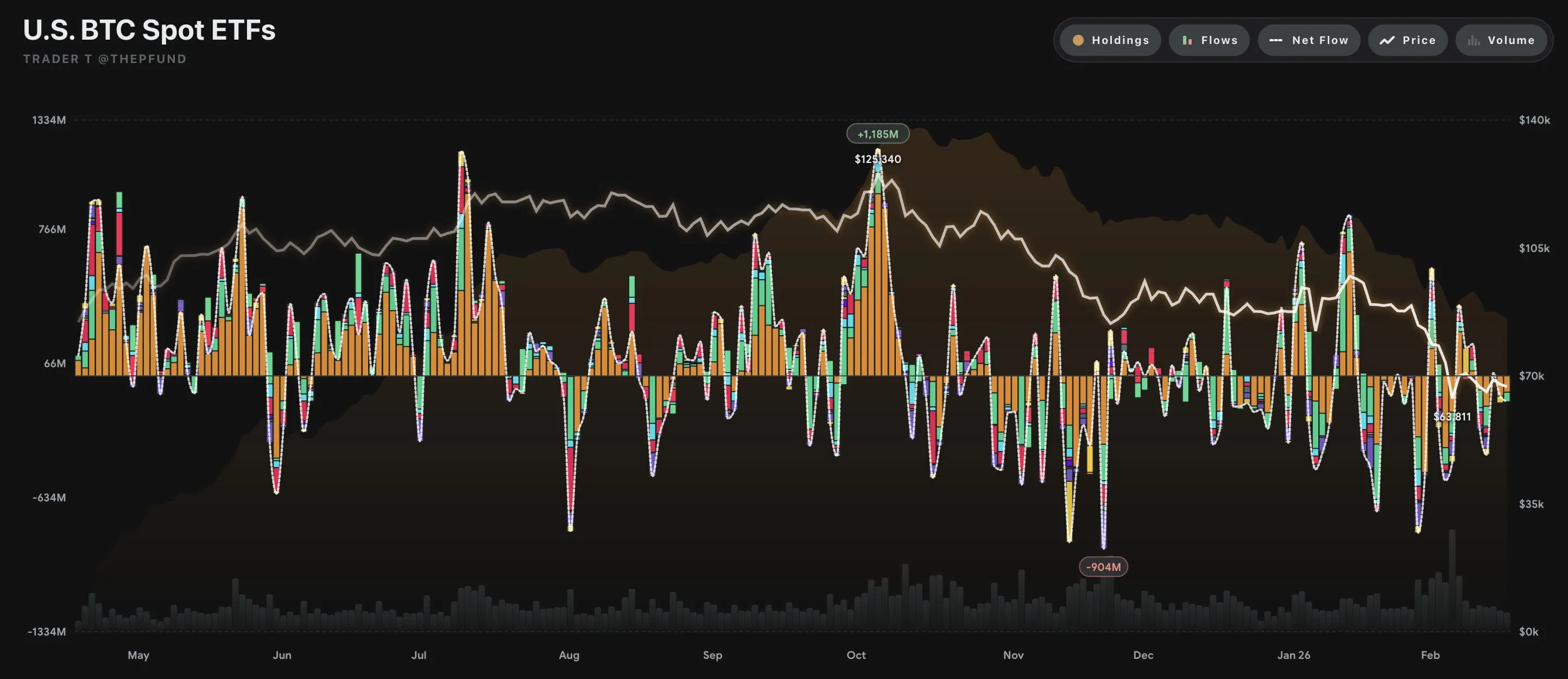 U.S. spot Bitcoin ETFs saw a total net outflow of $134.23 million on Feb. 18, marking the second consecutive day of net outflows, according to data compiled by Trader T. No individual ETF recorded net inflows.