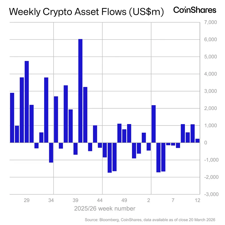 Digital asset investment products saw a total net inflow of $230 million last week, marking the fourth consecutive week of inflows, according to the latest weekly fund flow report from CoinShares. Bitcoin led the activity with $219 million in inflows, while Ethereum (ETH) experienced a net outflow of $27.5 million. Additionally, Solana (SOL), Chainlink (LINK), and Hyperliquid (HYPE) also recorded net inflows. By country, the United States led the inflows. CoinShares explained that investor sentiment appears to have weakened after the U.S. interest rate decision and FOMC meeting, as the market interpreted the Federal Reserve's stance as a hawkish hold. The firm noted that while strong inflows were observed at the beginning of the week, outflows occurred following the FOMC announcement.