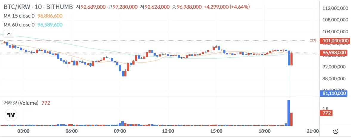 The price of Bitcoin experienced a flash crash on the South Korean exchange Bithumb, plummeting to 81.1 million won around 10:30 a.m. UTC today. At its lowest point, the price was over 16% below the global average. The price has since recovered to 97.15 million won.