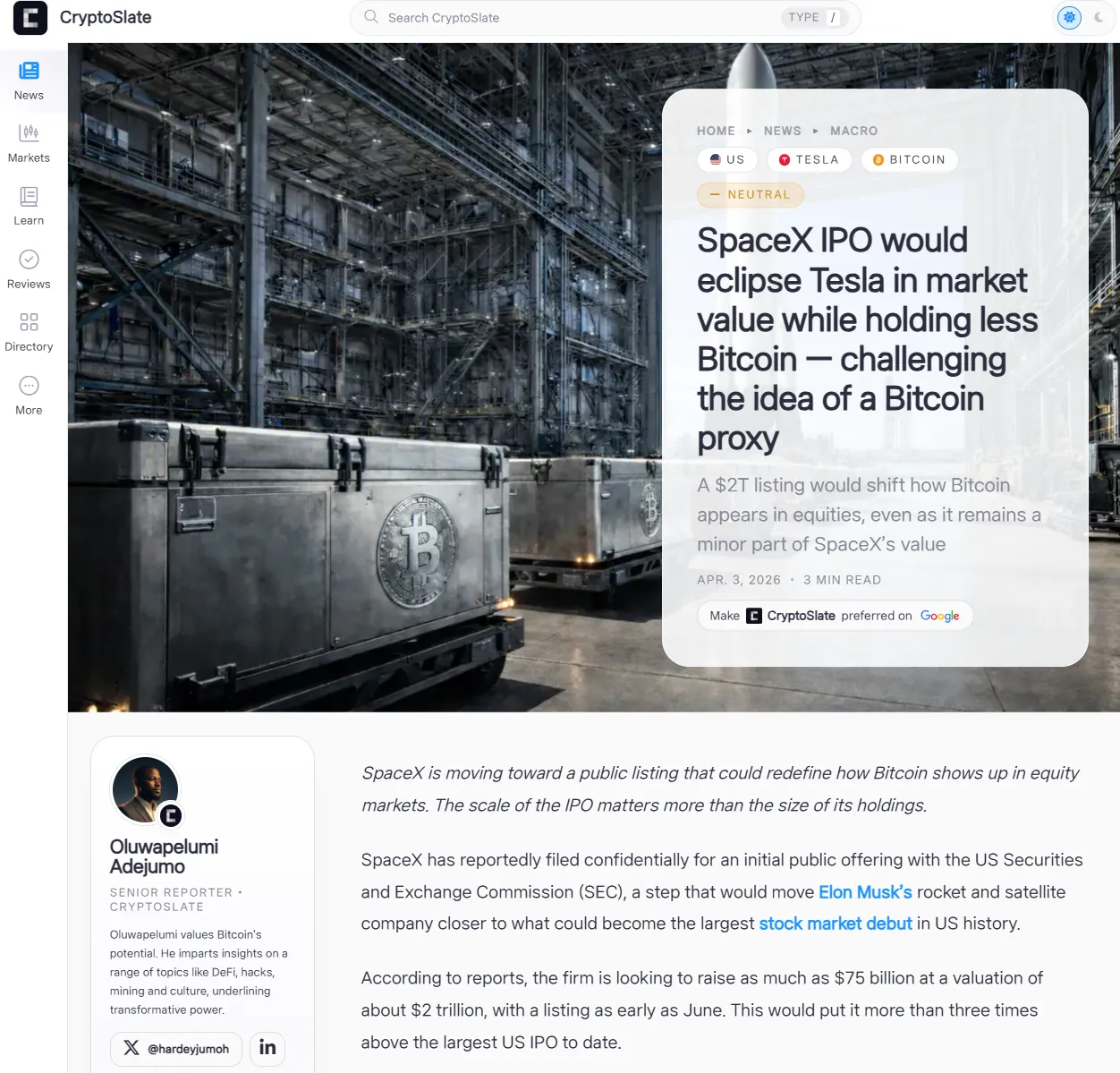 The stock market debut of SpaceX, Elon Musk's aerospace company, holds symbolic significance for Bitcoin, CryptoSlate reported. SpaceX has secretly filed for an initial public offering with the U.S. Securities and Exchange Commission (SEC), aiming for a June listing. The company is pursuing a valuation of approximately $2 trillion and aims to raise up to $75 billion. According to the media outlet, SpaceX currently holds 8,285 BTC, ranking it fourth among private companies. If SpaceX achieves its target valuation after listing, it would surpass Tesla's market cap despite holding less Bitcoin than Tesla's 11,509 BTC, making it the largest public company by market capitalization to hold BTC. While SpaceX's Bitcoin holdings represent less than 0.03% of its total assets, the outlet noted the significance of BTC being part of the asset composition of the world's largest space company.
