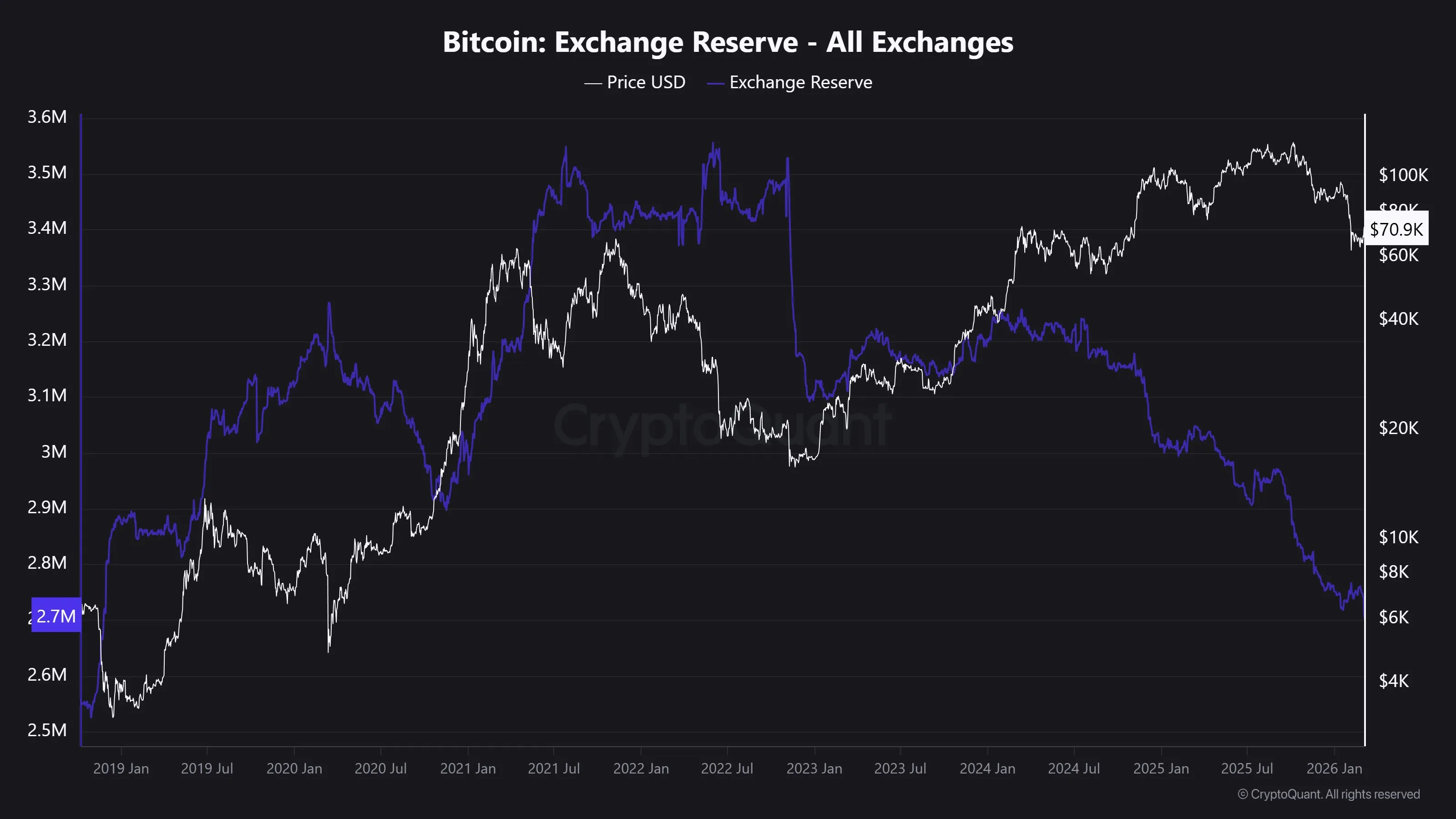 As of March 5, Bitcoin holdings on centralized exchanges (CEX) dropped below 2,708,000 BTC, the lowest level since November 2018, according to Unfolded.