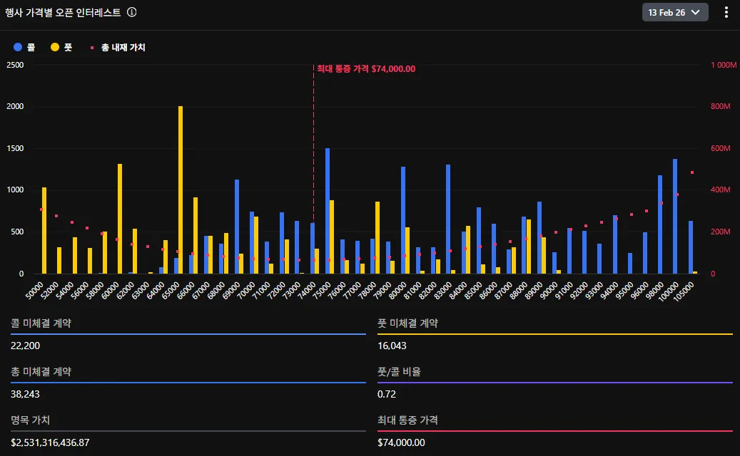 According to crypto options exchange Deribit, Bitcoin options worth $2.5 billion are set to expire at 8:00 a.m. UTC today, Feb. 13. The put/call ratio is 0.72, and the max pain price—the level at which the most option holders would see their contracts expire worthless—is $74,000. At the same time, Ethereum options valued at $420 million will also expire, with a put/call ratio of 0.85 and a max pain price of $2,100.