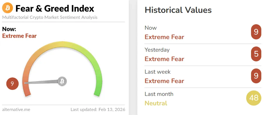 The Crypto Fear & Greed Index, compiled by data provider Alternative, rose four points from yesterday to 9. The market sentiment remains in the "Extreme Fear" phase. The index measures sentiment on a scale from 0, indicating extreme fear, to 100, representing extreme optimism. It is calculated based on volatility (25%), trading volume (25%), social media mentions (15%), surveys (15%), Bitcoin's market cap dominance (10%), and Google search volume (10%).