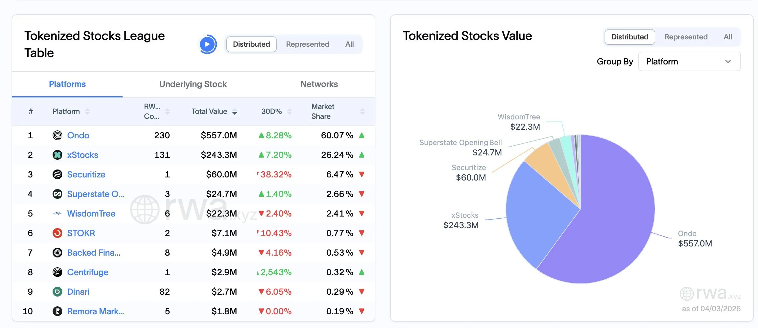 The market for tokenized assets has grown by 4.07% over the past 30 days, reaching a total size of $27.65 billion as of April, Wu Blockchain reported, citing data from rwa.xyz. The sector is noted as one of the few to record net inflows amid the broader cryptocurrency market downturn. Of this total, tokenized U.S. Treasurys account for half the market at $12.78 billion. Commodities represent $5.4 billion, while private credit stands at $3.19 billion. Equity tokens have a market size of $1 billion and have seen a trading volume of approximately $2.94 billion.