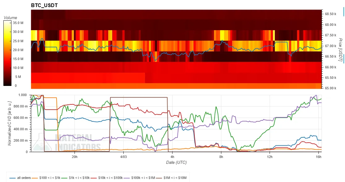 The spot Cumulative Volume Delta (CVD) chart analyzes the order book for the BTC/USDT spot trading pair. The upper section shows a volume heatmap, while the lower section displays the CVD. - The volume heatmap tracks the amount of trading volume at specific price levels. The background color becomes brighter in areas where the price either consolidates for an extended period or experiences a significant move. These brighter zones can indicate potential support and resistance levels. - The CVD indicator breaks down buy and sell orders by trade size. As buy orders within a category increase, the corresponding colored line rises. For example, the yellow line tracks orders between $100 and $1,000, while the brown line represents large-scale orders between $1 million and $10 million.