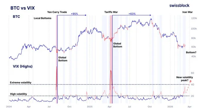 The Volatility Index (VIX), known as Wall Street's fear gauge, is also a valid indicator for Bitcoin, and a surge above 40 could represent the best buying opportunity for the asset, according to crypto data analytics firm Swissblock. In a post on X, the firm noted that Bitcoin exhibits volatility similar to U.S. stocks, with a VIX reading above 20 often indicating a short-term decline. However, Swissblock stated that buying when the VIX is high is a highly successful strategy, citing a 95% surge during the yen carry trade and a 63% jump at the start of the Trump-era tariff war. The firm explained that if escalating tensions in Iran and the Middle East push the VIX above 40, Bitcoin's next rally could be dramatic. Meanwhile, the VIX is currently at 27.28, up 12.63% from the previous trading day, according to TradingView.