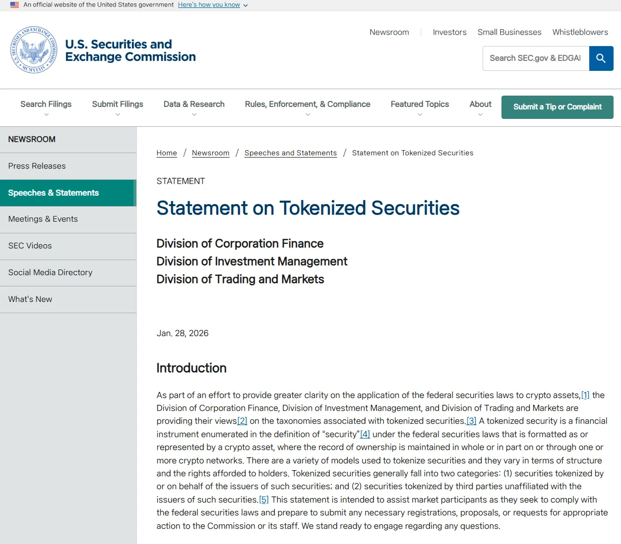 The U.S. Securities and Exchange Commission (SEC) has issued new guidance clarifying that existing securities laws apply to tokenized assets, such as stocks or bonds converted into digital tokens on a blockchain, regardless of the technology used. In a statement, the SEC noted that whether a security is represented on-chain or off-chain does not affect the application of federal securities laws, as the fundamental nature of an asset as a security takes precedence over the technology. The commission added that tokenized securities must comply with these laws even if not directly linked to an underlying asset. This announcement is expected to provide asset managers with the regulatory clarity needed to experiment with tokenization technology, DL News reported.