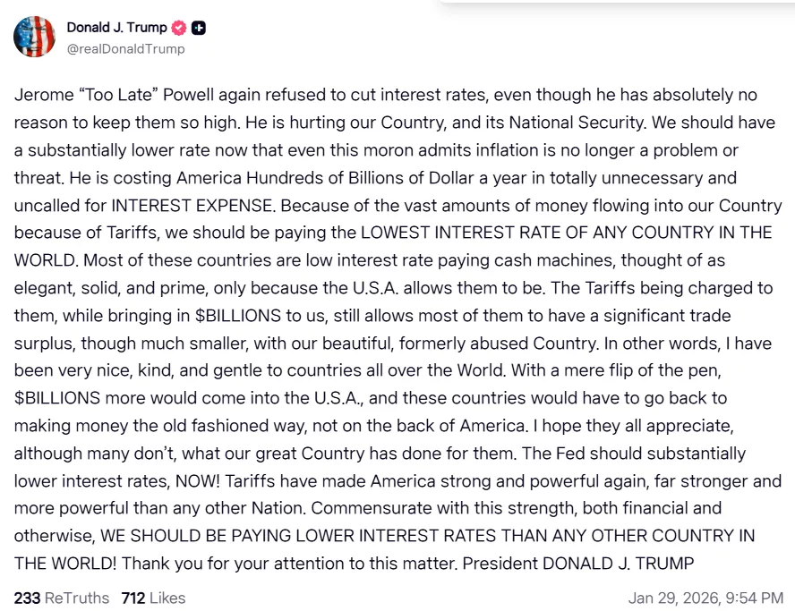 U.S. President Donald Trump criticized Federal Reserve Chair Jerome Powell on Truth Social, stating that the central bank has once again refused to lower interest rates. The president argued there is no reason for the U.S. to maintain such high rates, which he claimed are costing the country hundreds of billions of dollars annually in unnecessary interest payments. Trump asserted that due to the massive influx of money from tariffs, the U.S. should have the lowest interest rates in the world. He added that other countries with low-rate policies are taking advantage of the U.S. and should return to earning money through traditional means. Trump concluded by emphasizing that the Fed must implement a substantial rate cut immediately.