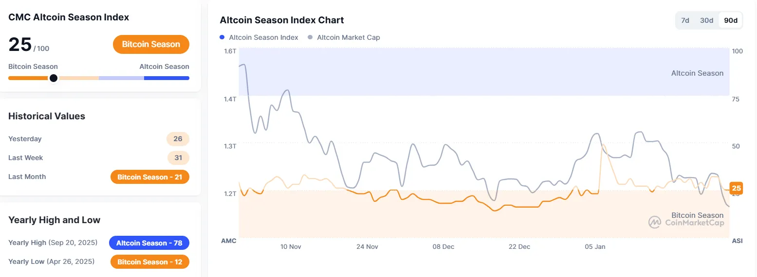 CoinMarketCap's Altcoin Season Index has fallen to 25, a drop of seven points from the previous day. The index measures whether market conditions favor altcoins over Bitcoin. An altcoin season is declared if 75% of the top 100 cryptocurrencies, excluding stablecoins and wrapped tokens, outperform Bitcoin over the past 90 days. A score closer to 100 indicates a stronger altcoin season.