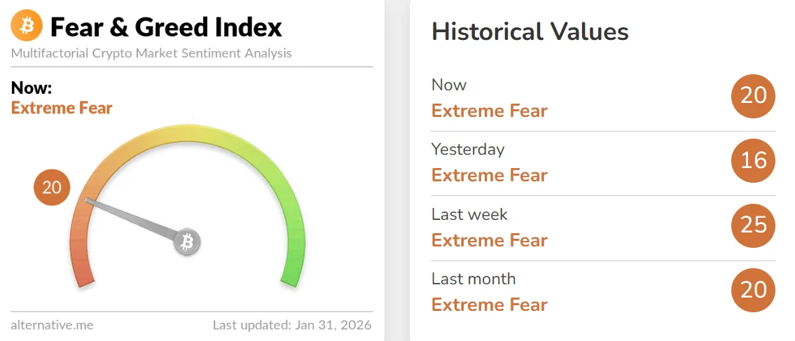The Crypto Fear & Greed Index, compiled by data provider Alternative, has risen four points from the previous day to 20. While investor sentiment has shown a slight recovery, the index remains in the "Extreme Fear" category. The index measures market sentiment on a scale where 0 represents extreme fear and 100 signifies extreme optimism. It is calculated based on several factors: volatility (25%), trading volume (25%), social media mentions (15%), surveys (15%), Bitcoin's market cap dominance (10%), and Google search volume (10%).