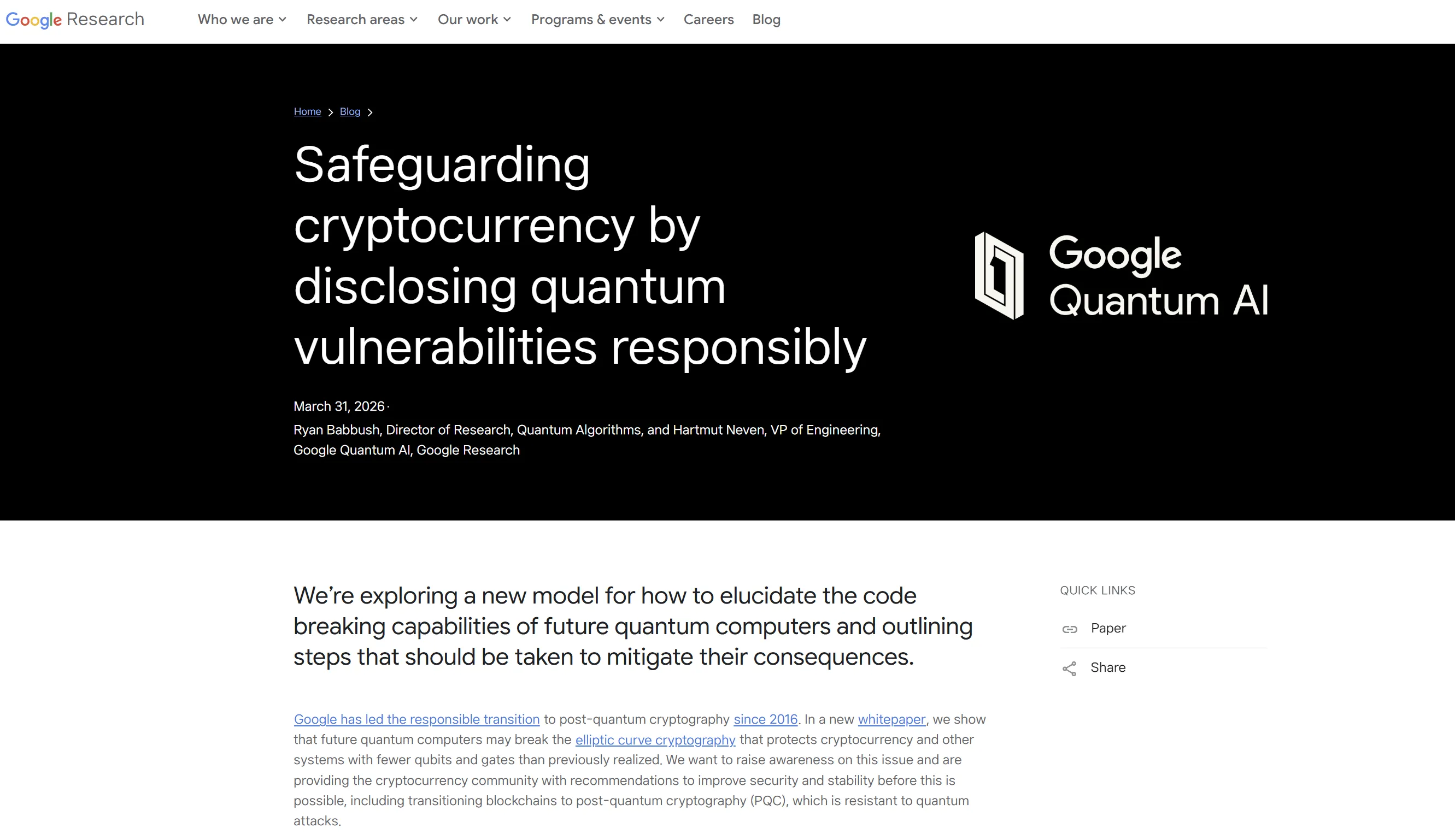 Bitcoin could be breached by quantum computing attacks sooner than previously anticipated, according to recent research from Google's Quantum AI team. CoinDesk reported that the research suggests breaking Bitcoin's security, once thought to require millions of qubits, may be possible with fewer than 500,000. The team warned that the technological gap to achieve this capability might be smaller than expected.