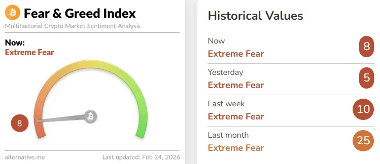 The Crypto Fear & Greed Index from data provider Alternative is at 8, up three points from yesterday. This reading indicates that the market remains in a state of extreme fear. The index measures market sentiment on a scale where 0 represents extreme fear and 100 signifies extreme optimism. The score is calculated based on volatility (25%), market volume (25%), social media mentions (15%), surveys (15%), Bitcoin's market cap dominance (10%), and Google search trends (10%).