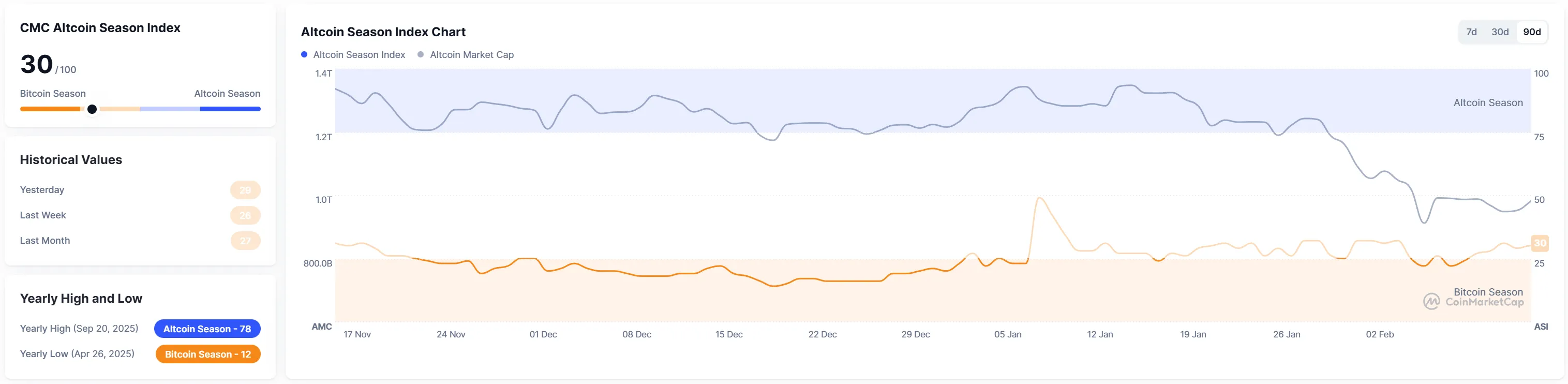 The Altcoin Season Index from crypto data provider CoinMarketCap has fallen three points from yesterday to 30. The index measures market sentiment by comparing the performance of the top 100 cryptocurrencies by market capitalization, excluding stablecoins and wrapped tokens, against Bitcoin over the past 90 days. An altcoin season is declared when 75% of these coins outperform Bitcoin during that period, with a reading closer to 100 indicating stronger altcoin performance. Conversely, a low score suggests a Bitcoin season.