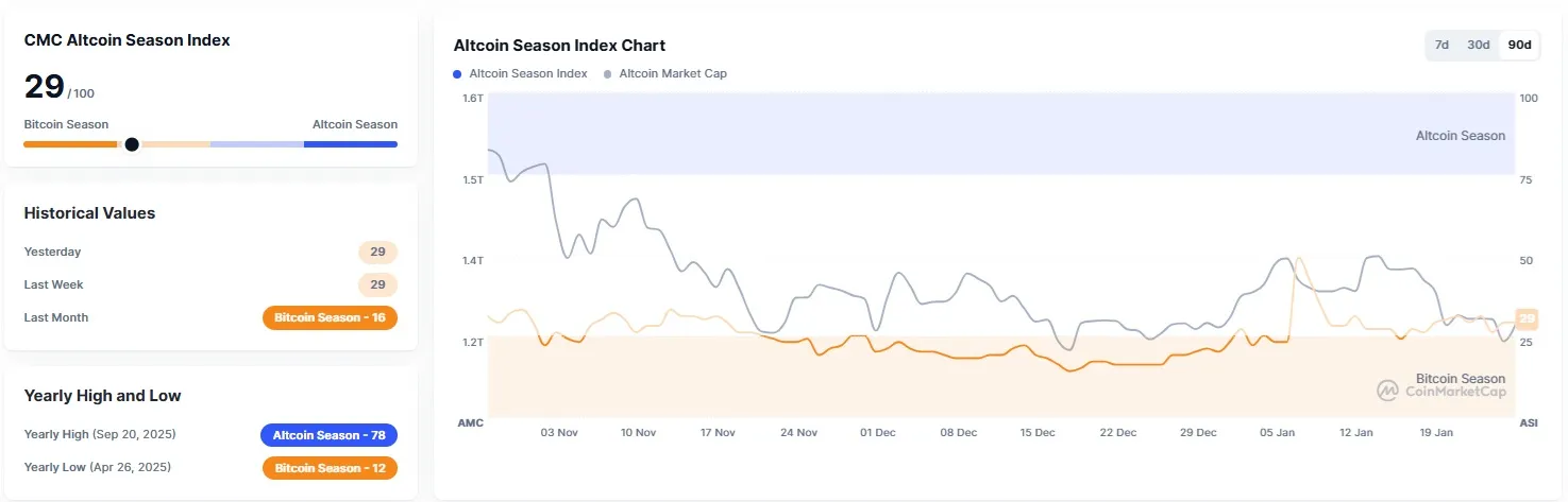 CoinMarketCap's Altcoin Season Index has risen two points from yesterday to 29. The index determines whether it is an altcoin season or a Bitcoin season by comparing the price performance of the top 100 coins, excluding stablecoins and wrapped tokens, against Bitcoin. An altcoin season is declared when 75% of these top 100 coins outperform Bitcoin over the preceding 90 days. A score closer to 100 indicates a stronger altcoin season.