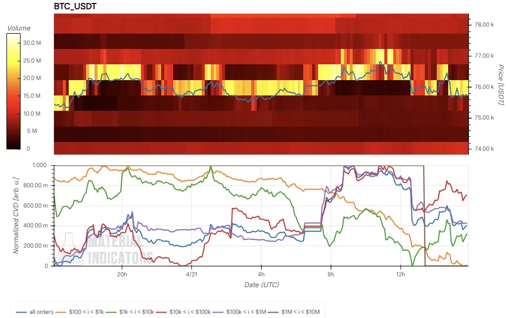 - The CVD indicator at the bottom represents buy and sell orders categorized by trade size. The corresponding colored line rises as buy orders increase. For example, the yellow line tracks orders between $100 and $1,000, while the brown line represents large orders ranging from $1 million to $10 million.
