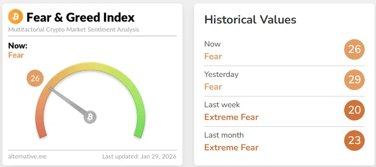 The Crypto Fear & Greed Index from data provider Alternative stands at 26, down three points from yesterday and remaining in the "fear" category. The index measures market sentiment on a scale where 0 indicates extreme fear and 100 represents extreme greed. It is calculated based on factors including volatility (25%), trading volume (25%), social media mentions (15%), surveys (15%), Bitcoin's market cap dominance (10%), and Google search volume (10%).
