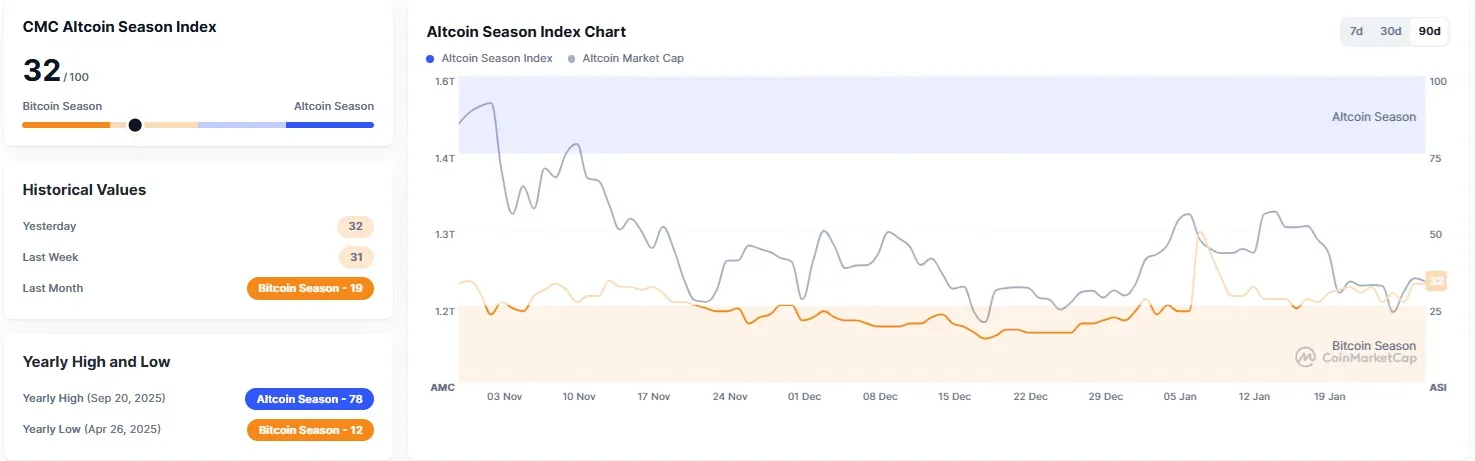 CoinMarketCap's Altcoin Season Index has risen seven points from yesterday to 32. The index measures whether it is an altcoin season or a Bitcoin season by comparing the price performance of the top 100 coins by market capitalization, excluding stablecoins and wrapped coins, against Bitcoin. An altcoin season is indicated if 75% of the top 100 coins have outperformed Bitcoin over the past 90 days. A reading closer to 100 suggests the market is in an altcoin season.