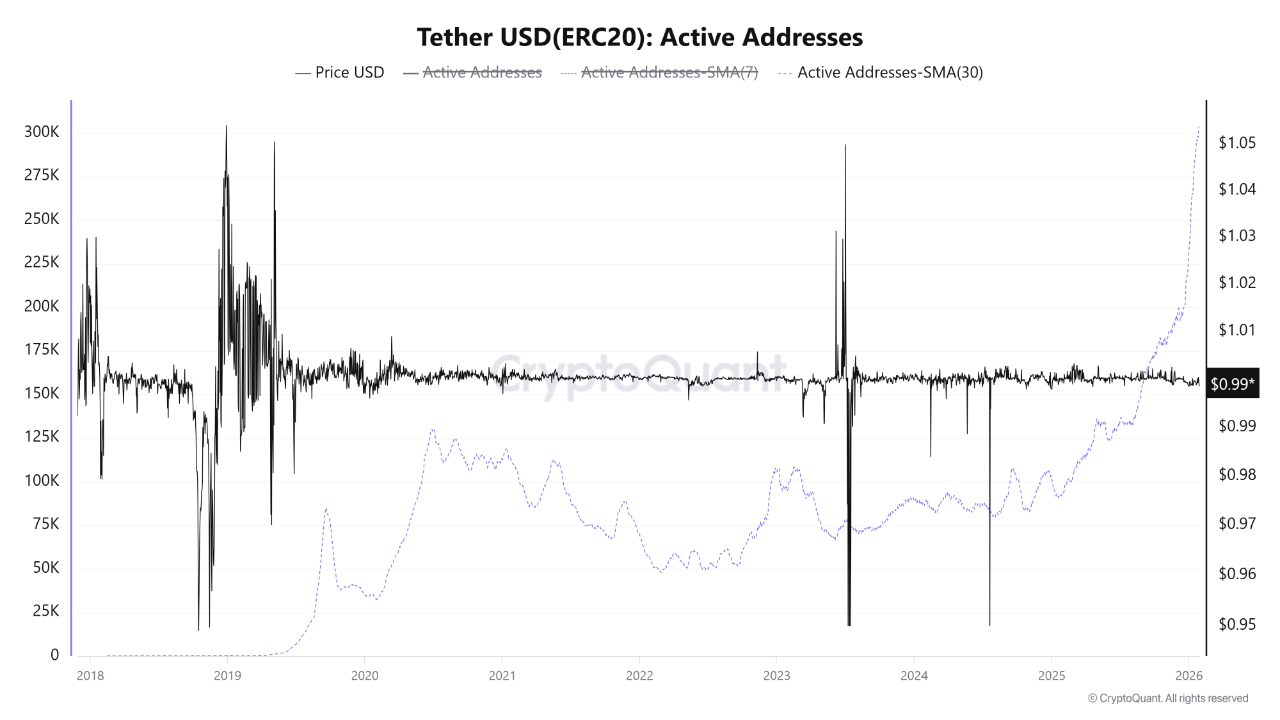 The 30-day moving average of active addresses for Ethereum-based USDT has surged to an all-time high of approximately 300,000, according to crypto analyst CryptoOnchain. This occurred as Bitcoin's price declined after failing to break through the $92,000 resistance level. The analyst noted that on-chain indicators and stablecoin outflows from exchanges suggest this activity reflects a shift of funds into DeFi protocols and self-custody wallets, rather than an inflow into centralized exchanges. CryptoOnchain concluded that liquidity is currently concentrated within the Ethereum network and could be redeployed into the broader market once a clear directional trend emerges.
