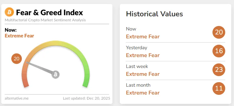 The Crypto Fear & Greed Index rose four points from the previous day to 20, according to data provider Alternative. Despite the slight improvement in investor sentiment, the market remains in the "Extreme Fear" stage. The index, which measures market sentiment on a scale of 0 (Extreme Fear) to 100 (Extreme Greed), is calculated based on volatility (25%), trading volume (25%), social media mentions (15%), surveys (15%), Bitcoin's market cap dominance (10%), and Google search volume (10%).