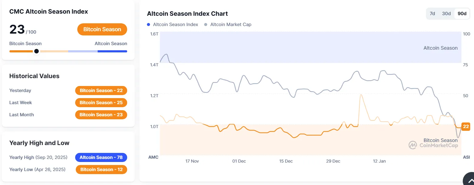 CoinMarketCap's Altcoin Season Index has fallen by one point from yesterday to 23.