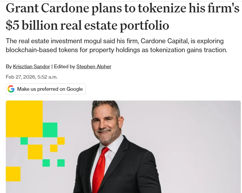 U.S. real estate investor Grant Cardone plans to tokenize $5 billion worth of property owned by his investment firm, Cardone Capital, CoinDesk reported. The firm announced last April that it would create a new fund composed of 10 properties to purchase BTC.
