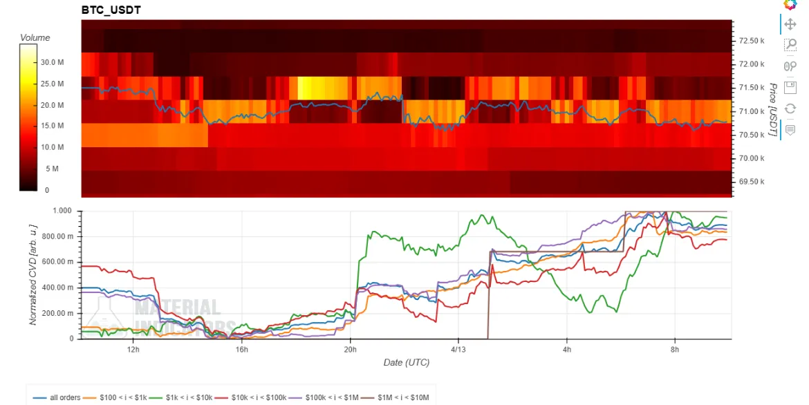 - The bottom CVD indicator represents buy and sell orders categorized by trade size. As buy orders increase, the corresponding colored line rises. For example, the yellow line tracks orders between $100 and $1,000, and the brown line tracks large orders between $1 million and $10 million.