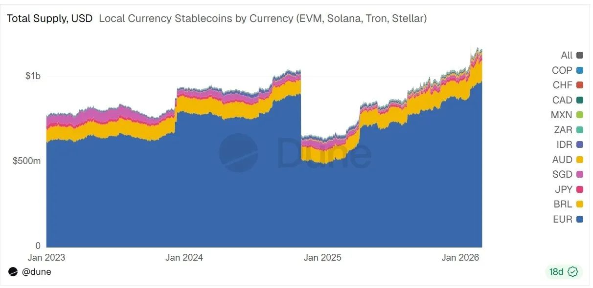 The supply of non-U.S. dollar stablecoins reached $1.1 billion in February, Unfolded reported. The number of addresses holding these coins is estimated at around 1.2 million.
